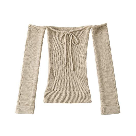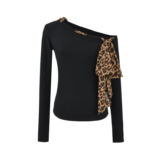Leopard print drawstring tied diagonal shoulder long sleeved T-shirt